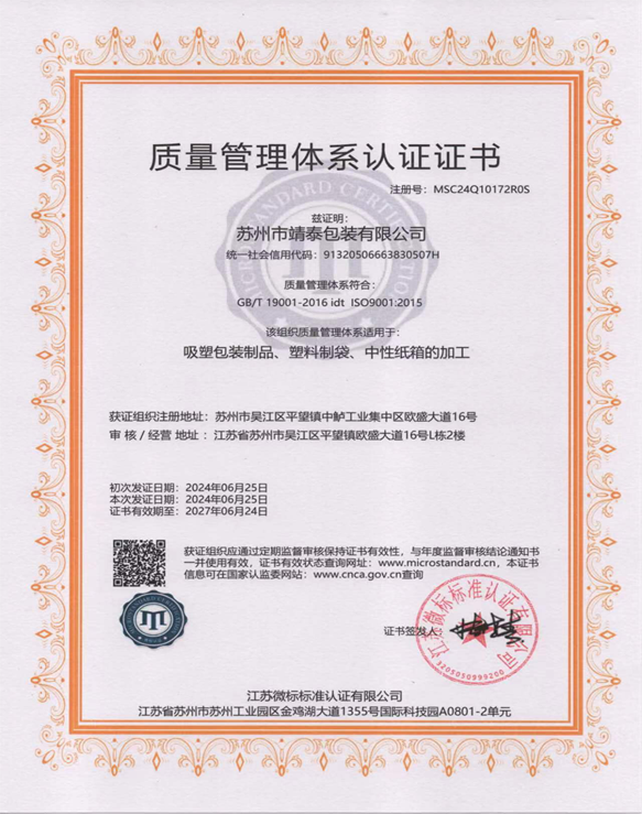 公司质量方针:品质求生存、服务为信誉、管理出效益 品质:不断提高我们产品的品质是我们靖泰人不断追求的目标 技术:加强研究开发不断提高产品的制造技术和适用性 服务:以卓越的品质高效的工作精湛的技术为顾客服务 质量承诺:在交期之内生产出优质的产品满足客户不同层次的需求 靖泰公司引进了国外全套先进的设备,同时也引进了先进的生产管理模式,严格的品质控制,保证公司一贯坚持为客户提供良好服务的经营理念“时间保证、质量保证、满足客户需求,以诚信与各界朋友携手共进。